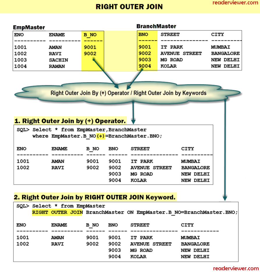 Two different ways are available for Right Outer Join. Either you can use (+) operator or you can use RIGHT OUTER JOIN keyword to join tables. both syntax generate same results.